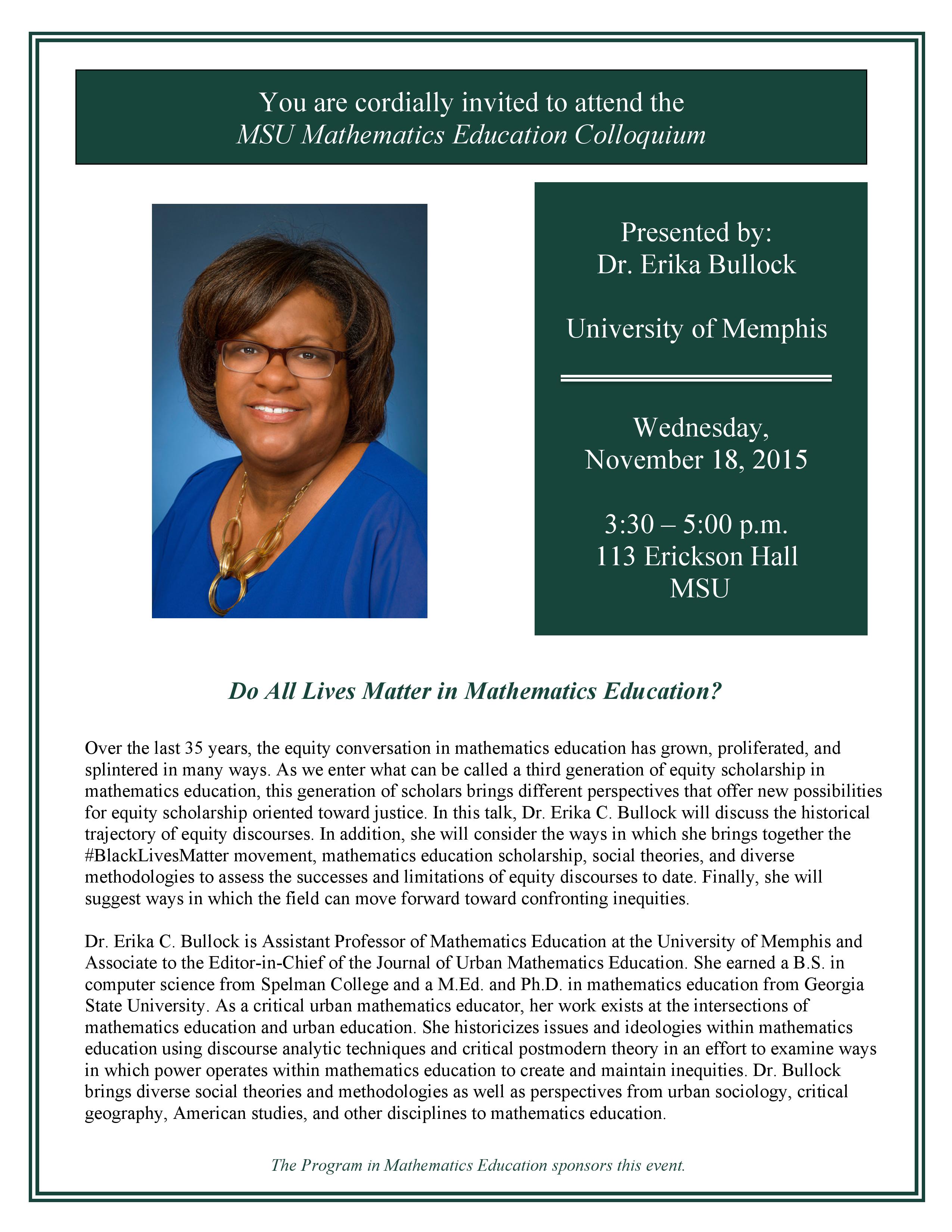 I’m Dr. Erika C. Bullock. I’m a professor and scholar who studies the racial politics of mathematics and STEM education. I also like to share my thoughts at the intersections of faith and academic life.